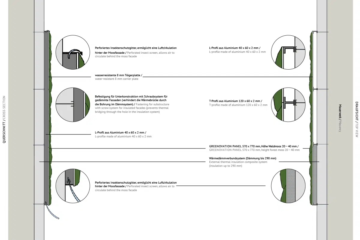 The climate facade has a 50-year guarantee on the carrier plate and 6 years on the moss itself. In practice, we expect a lifespan of over 25 years without any maintenance.