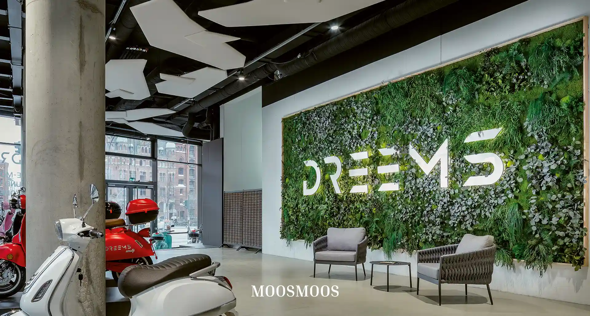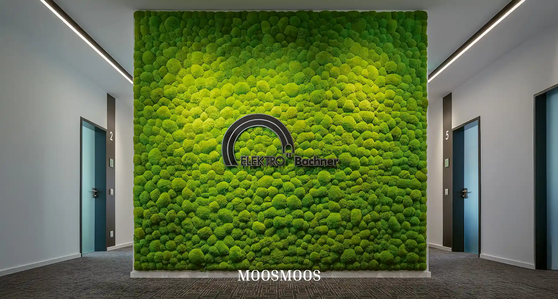 The MOOSMOOS moss wall with logo offers an impressive combination of natural beauty and individual design. With our logos & graphics made of moss and the wide selection of colors from our own manufactory and dye works, your logos integrate perfectly into your corporate identity. Whether as a striking moss lettering, in a moss wall logo, or a moss logo wall, we design your logos & graphics in moss exactly according to your ideas to highlight the individuality of your brand.